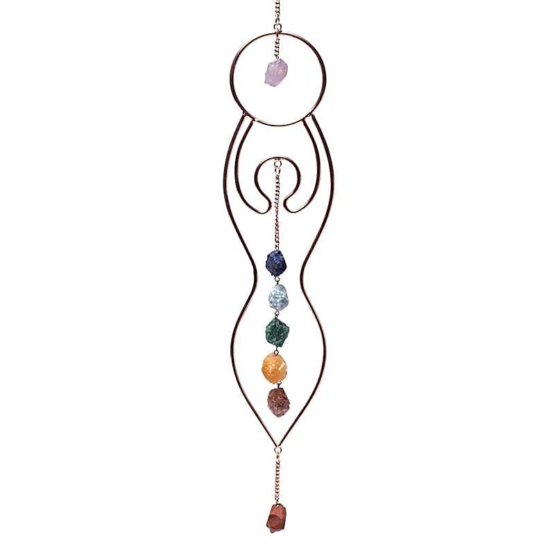 Die Figur ist mit sieben Edelsteinen geschmückt, die den Chakren zugeordnet sind.