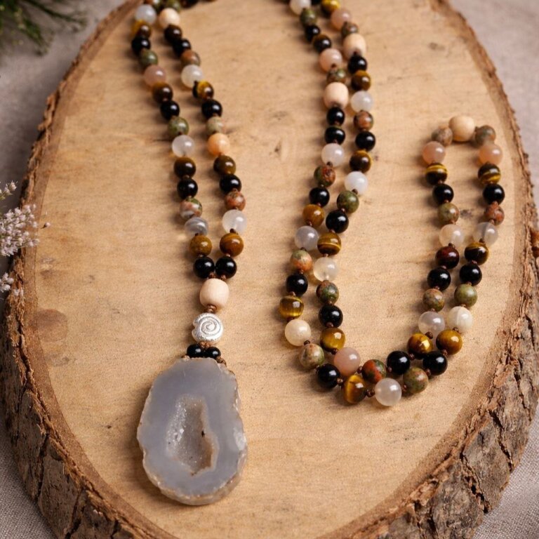Die Perlenanzahl richtet sich nach dem Zyklus der Mondin und jede Luna ist von Hand geknüpft. Umfang ca. 86cm, Anhänger mit Perlen 5cm.