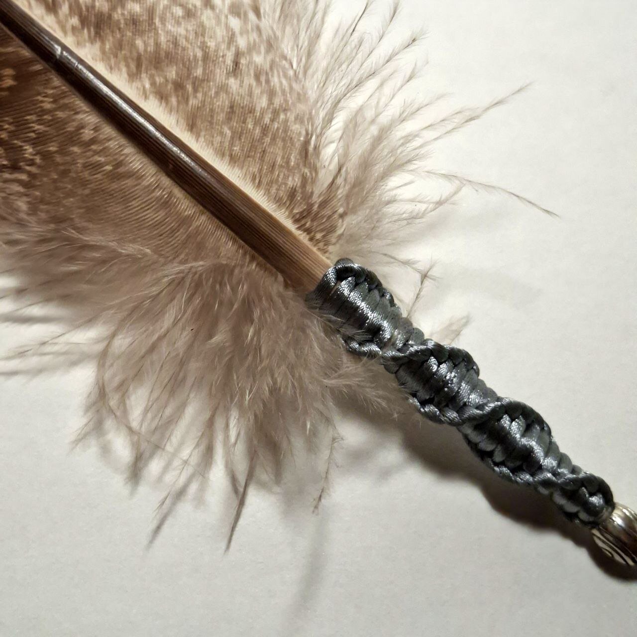 Die Naturfeder ist mit einem handgeknüpften Griff und ausgewählten Perlen geschmückt – jedes Stück ist ein Unikat mit einer Größe von ca. 25cm und trägt seine eigene Energie.