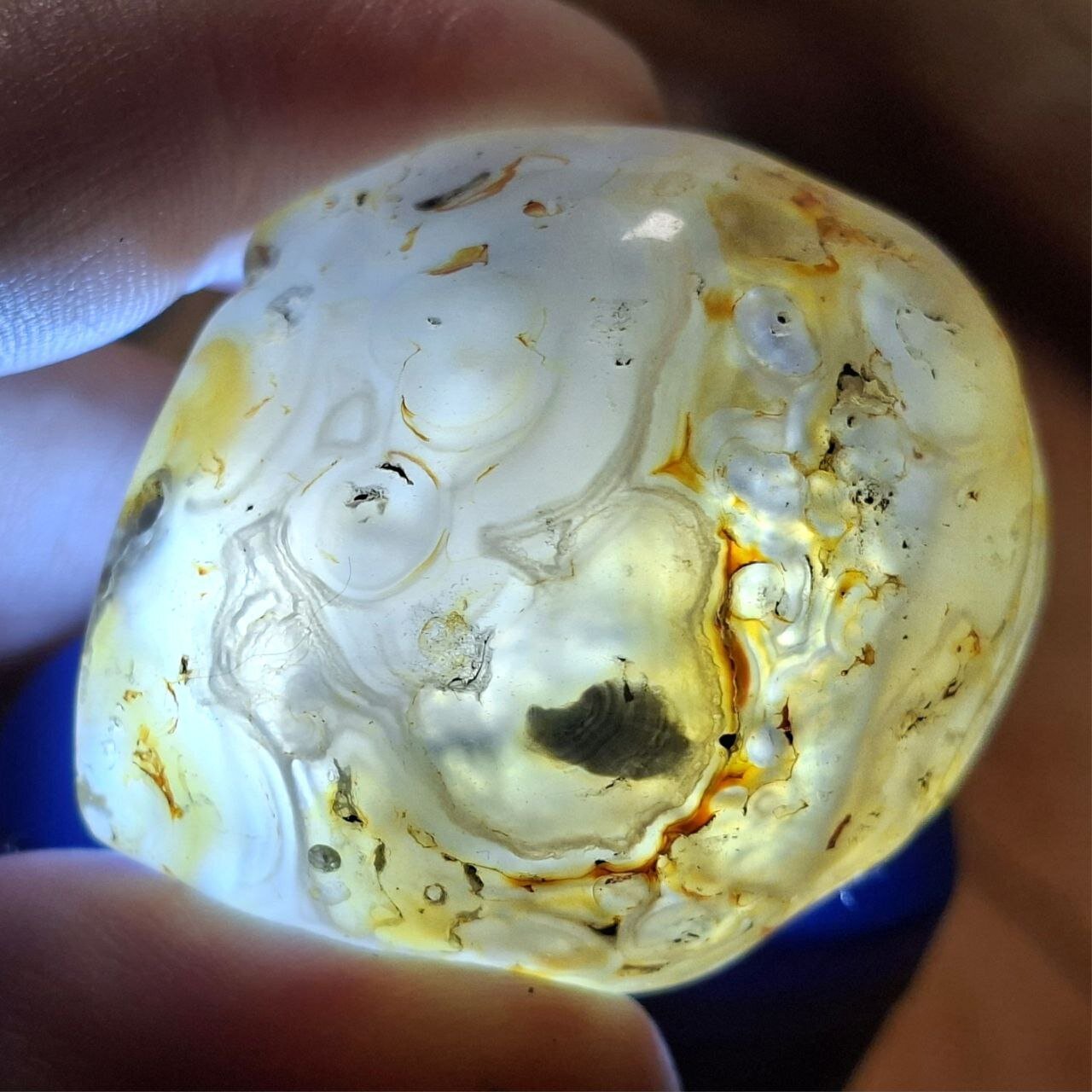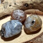 Der Wasserachat ist eine seltene Besonderheit unter den Achaten. In seinem Inneren befindet sich eingeschlossenes Urwasser, das seit Millionen von Jahren im Stein bewahrt wurde. Beim Bewegen kann man das Wasser im Inneren spüren und sehen (am Besten mit Taschenlampe von unten anleuchten).